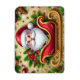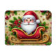 Eine fröhliche Darstellung des Weihnachtsmannes in einem roten Schlitten inmitten festlicher Dekorationen mit Kieferntönen und Ornamenten. Ideal für Weihnachts- und Weihnachtsfeiern.
