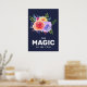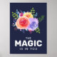 Ein Poster mit dem inspirierenden Text: Die Magie ist in dir. Entworfen mit einem hübschen Bouquet von Aquarellfarben-Rose, die in einer farbenfrohen Blumenstruktur mit Ziern, Blätter und Ästen verwoben sind. Navy Hintergrund.
