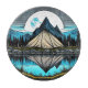Ai art, die ein Camping-Zelt darstellt, das im Wasser eines Sees mit Kiefernwald und Berghang reflektiert, während der Vollmond abstrahlt. Generatorischer Inhalt mit Vintagem Ambiente. Blau und braun.