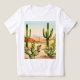 The image is a watercolor illustration of a desert landscape featuring large cacti and green shrubs.