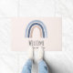 Herzlich willkommen vor der Tür mit einem niedlichen und skurrilen Regenbogen. Blau und pfirsichfarben.