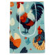 Hühner und Röster Nahtloses Muster. Bauerntiere; Roster und Hen Graphic Design. Weiß, blau, rot und orange.