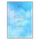 This table number features a serene watercolor design with soft blue and white hues, creating a calming and inviting atmosphere. The elegant cursive typography adds a touch of sophistication, making it perfect for dessert bars at weddings or special events. The minimalist layout focuses on the phrase "Dessert Bar" in stylish script, encouraging guests to indulge in sweet treats. Ideal for enhancing the ambiance of any celebration, this design combines artistry with functionality.