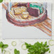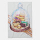 Unter einer Glaskuppel, die sich auf einem Holzfußboden befindet, wird eine Vielfalt an bunten und köstlichen Backwaren und Kuchen präsentiert. Das Arrangement umfasst eine Auswahl an Leckereien wie Kuchen und Kuchenscheiben.