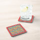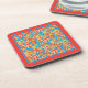 Un ensemble de 6 dessous de verre à dos de liège avec un joyeux motif tout-en-un de fleurs rouges, orange et jaunes sur un arrière - plan turquoise clair, et une bordure orange vif, d'un collage de papier peint à la main par Judy Adamson.
