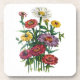 Illustration botanique ancienne des fleurs de zinnia en rouge, jaune violet et blanc