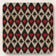 Red hearts and diamonds and black clubs and spades on a background of black and tan diamond shapes. Make sure to check out the matching throw pillows !