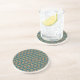 Un dessous de verre rond en grès, avec un motif de petits coeurs rouges et verts sur un arrière - plan turquoise foncé dans le style "Folk Art".