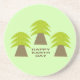 Ce magnifique dessous de verre en grès présente une image graphique de trois arbres qui ressemblent à des palmiers avec de grandes frondes vertes et un tronc d'arbre brun robuste. Il y a un message en texte marron pour ressembler à du sol sous les arbres. Le message dit Happy Jour des terres.