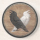Des dessous de verre de boissons de grès de qualité comportant les corbeaux d'Odin comme torsion fraîche sur le symbole de Ying Yang au-dessus de l'arrière - plan en bois admirablement patiné de bouclier de Viking.