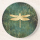Ce magnifique dessous de verre en grès présente une libellule dorée sur un arrière - plan de grunge vintage vert émeraude.