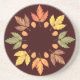 Des feuilles jaunes, oranges, bruns et verts sont disposés en cercle.