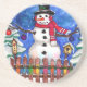 Un tableau d'aquarelle de Sandra Gale d'un neigeur traditionnel debout devant une clôture de piquetage avec des lumières de Noël brillantes reflétant la neige d'hiver. Oiseaux, maisons d'oiseaux et ornements de Noël en font une scène de Noël classique qui a l'air bien sur papier d'emballage, carte de fin de année et plus !