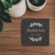 Ce sobre et élégant porte-boissons monogrammé sur mesure possède des branches de laurier verdoyantes qui portent un nom de famille. Un beau cadeau de conservation pour les jeunes mariés ou les nouveaux propriétaires. Les couleurs du design noir et blanc peuvent être modifiées pour correspondre à votre décor maison.
