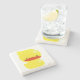 Un canard en caoutchouc jaune gai et souriant contre un dessous de verre en pierre blanche arrière - plan.