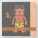 Ce dessous de verre en pierre présente un chibi, dessin animé d'un oni rouge. Le oni (鬼) est l'équivalent japonais d'un ogre. Ils sont souvent représentés avec de la peau rouge et des cornes, portant un drap imprimé tigre et portant un club pointillé. Le nom du monstre, en kanji japonais, apparaît en haut à gauche.