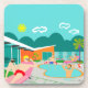 Ces dessous de verre en plastique durs de rétro réception au bord de la piscine gaie comportent quatre beaux mâles hunky ayant un ancien gai pendant qu'elles battent la chaleur de Palm Springs par lounging autour l'eau bleue de turquoise de leur piscine formée par boomerang atomique. L'architecture moderne de la moitié du siècle sur la maison en pierre fabuleuse et orange est clairement les immobiliers principaux, donnés l'avis des montagnes à l'arrière-plan. Un soleil jaune de starburst brille brillamment dans le ciel de turquoise ainsi vous pouvez voir chaque détail avec du charme--des flamants kitschy et roses aux années 1950 barrées, barrière fraîche de blocs. Et naturellement quelle Chambre de Palm Springs serait complète sans palmier ?