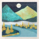 Un magnifique paysage avec des textures uniques montrant un paysage de rivière et de montagne avec une lune montante et ciel étoilé dans les tons de bleu, or, vert foncé et jaune.