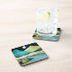 Un magnifique paysage avec des textures uniques montrant un paysage de rivière et de montagne avec une lune montante et ciel étoilé dans les tons de bleu, or, vert foncé et jaune.