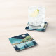 Un magnifique paysage aux textures uniques qui montre un paysage lacustre de montagne avec une lune montante et un ciel étoilé dans les tons bleu, or, vert et turquoise.