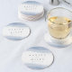 Ce dessous de verre en papier mariage chic côtier est assorti à notre collection Ebb Tide, avec des lave-linge en aquarelle de couleur bleu périvent poussiéreux le long du haut et du bas, avec votre texte personnalisé en lettres grises douces.