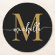 Girly Modern Simple Élégant Monogramme noir et or Nom initial Signature Script Personnalisé Dessous de verre papier rond personnalisé. Ce design avec votre prénom dans une jolie typographie de police de queue d'essuie-glace (ou calligraphie) à la main avec un monogramme initial en or et blanc sur noir. Ils sont faciles à customiser. Grand cadeau de ménage féminin élégant, aussi pour anniversaire, mariage, fête de 16 ans, douche nuptiale, jour de mère, baby shower, pour la fête de remise des diplômes et C’est pour la fille qui aime des choses stylées uniques et minimes.