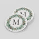 Elégant design de dessous de verre de boisson ronde avec un chic rustique arrière - plan de grains de bois blanc avec une couronne de verdure d'hiver aquarelle encadrant une famille / nom de famille monogramme initial.