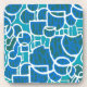 Un ensemble de 6 dessous de verre design avec dossier de liège, d'un motif abstrait turquoise, vert mer, bleu et blanc foncé, à partir d'un sérigraphie de Judy Adamson.