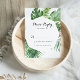 Ces cartes RSVP de destination géométrique verdoyante tropicale sont parfaites pour un mariage moderne. Le design se compose de palmiers verts aquarelés peints à la main et de feuilles de bananes soigneusement arrangés en de beaux bouquets, ornant un cadre géométrique.