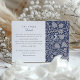 Diese exquisit detaillierte Informationskarte ist die perfekte Ergänzung zu einer Viktorianischen Hochzeitssuite. Ein eleganter marineblauer Hintergrund ist mit einem raffinierten Cremedesign mit verflochtenen Blumen und Weinreben geschmückt, das auf eine vergangene Ära der Eleganz zurückgeht. Die zentrale Bühne dieses Designs sind zwei herrschaftliche Liebesvögel, die jeweils von einem verzierten Monogramm begleitet werden, das die Gewerkschaft von zwei Herzen symbolisiert. Diese Gehäusekarte informiert nicht nur, sondern erfreut sich mit ihrem Vintagen Charme und den aufwändigen Details. Die Rückseite bietet Platz für zusätzliche Hochzeitsdetails, von den Richtungen bis zu den Geschenkvorlieben, die alle in einer gleichermaßen eleganten Schrift vermittelt werden. Diese Karte ist ein echter Hingucker und lädt die Gäste dazu ein, sich an der Liebe zu beteiligen, während sie ihnen die feinen Details der Feier zur Verfügung stellen.