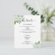 Un mariage moderne, élégant détails / programme / chronologie. Un arrière - plan blanc, décoré de fleurs blanches à l'eau et de végétation d'eucalyptus. Personnalisez et ajoutez vos noms et les détails du mariage. Lettres de couleur noire. Texte des deux côtés. 1 feuille = 1 programme imprimé de bord en bord.