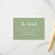 Die weiße, stylisierte Kapselkarte in grüner Farbe enthält die Anleitung, alle Details der Hochzeit des Paares auf ihrer Hochzeitswebseite zu finden. Passen Sie Ihre Gehäusekarte an, indem Sie den gewünschten Text bearbeiten und den Namen der Webseite durch Ihren eigenen ersetzen.