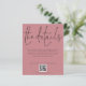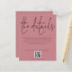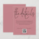 Hochzeitdetails QR Code Skript Dusty Rose Gehäuse. Eine Alternative zum Haushaltspreispapier. Umschläge sind optional. Lass deinen Gästen Informationen wie Anfahrtsbeschreibung und Unterkunftsinformationen für deine Hochzeit, wenn du ihre Einladungen versenden kannst. Dieses elegante Design hat Set stilvolle große Typografie für den Titel The Details und die Erholung des Textes können leicht personalisiert werden, um Ihre Worte zusammen mit Ihrer Website QR-Code. Sie können jede beliebige Farbe für Text- und Hintergrundfarben auf beiden Seiten über die weitere Option anpassen.
