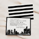 Die Vintagen inspirierten Hochzeitseinladungen in der Landschaft zeigen ein einzigartiges geätztes Bild der Skyline der Stadt Downtown Detroit, die im Abend entlang der Flussufer aufgenommen wurde, kombiniert mit Vintager Art-Déco-Typografie und einem klassischen Schwarz-Weiß-Farbschema. Dieses Einladungs-Design beinhaltet einen schwarz gedruckten Rahmen und ein fett gemustertes Muster schwarz-weißer Streifen auf der Rückseite.