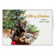 Auf dieser Urlaubskarte legt ein schöner deutscher Schäferhund in seinem Korbbett vor einem verzierten Weihnachtsbaum. Hinter dem Korb befindet sich auch ein hübscher roter Strauß- und Pinienbouquet. Der goldene Text auf der rechten Seite sagt "MERRY CHRISTMAS", mit GLÜCKLICHEM NEUEN JAHR in grün darunter. Der gesamte Text, innen und außen, kann leicht auf alles geändert werden, was man möchte. Im Dog Village können Sie mehr Bilder von deutschen Hirten sehen, ebenso wie andere Bilder von Rassen.