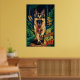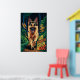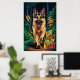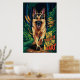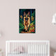Ein deutscher Schäferhund läuft durch einen Wald, seine Pfoten schlagen den Schmutzweg. Der Hund hat einen entschlossenen Gesichtsausdruck und sein Schwanz bewegt sich leicht. Die Wörter Lead With Strength, Follow With Heart sind auf der rechten Seite des Bildes gedruckt.