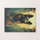 Farbenfrohe Kunst mit einem deutschen Hirten im Wald bei Sonnenuntergang.