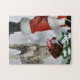 Adorable deutsche Kurzhaarchancen auf den Weihnachtsmann im Wald.