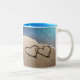 Belle photo originale de deux coeurs écrits dans le sable le long de l'eau bleue de l'océan pour signifier amour et romantisme. Grand concept pour la Saint Valentin à venir, romance d'été et mariage. Beaucoup de styles de tasses et de couleurs sont disponibles. Faites de merveilleux cadeaux pour le couple heureux.