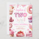 Célébrez le doux jalon de votre petit avec cette adorable invitation à l'anniversaire "TWO Sweet" ! Parfait pour la fête du 2e anniversaire d’une fille, cette invitation modifiable présente un thème de dessert rose amusant avec beignets, cupcakes, glace, macarons et arrosages, le tout dans des couleurs pastel oniriques.