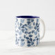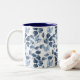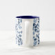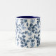 Une deuxième version de la tasse avec le motif bleu feuillu, cette fois avec un intérieur bleu foncé pour contraster et faire le design sur l'extérieur pop. Je pense que l'aquarelle florale feuillue ressemble à des coutures de denim bleu.