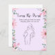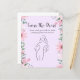 Il s'agit d'une carte de jeu de douche nuptiale imprimable intitulée "Guess the Dress". Le design est d'un arrière - plan violet clair et encadré par une bordure décorative de fleurs roses et blanches avec des feuilles verts. Le titre est écrit dans une police de script fantaisiste. Sous le titre, les instructions, "Dessinez à quoi ressemblera la robe de mariée mariage", sont écrites en une simple police manuscrite. Le centre de la carte est constitué d'un simple dessin en noir et blanc d'une femme dans une pose debout, fournissant une toile vierge aux invités pour esquisser leurs prédictions sur la robe mariage.
