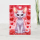 Le design présente une scène chaleureuse qui capture le charme fantasque d'un chat Devon Rex blanc au milieu d'un battement de coeurs rouges. Ce félin joyeux, face à l'avant, à la fourrure particulièrement molle, bouclée et aux oreilles surdimensionnées, est l'incarnation de la joie et de l'affection. Les yeux brillants et intelligents du Devon Rex et son sourire impeccable sont entourés d'une tapisserie de coeurs rouges, symbolisant l'amour et le plaisir que cette race apporte dans nos vies, surtout le jour de la Saint-Valentin.