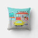 Servez quelque chose spéciale avec ce coussin extérieur de wagon-restaurant des années 1950. Les caractéristiques de conception de dessin de bande dessinée un immeuble de brique rouge avec les fenêtres bleues, les portes à deux battants grises, et un signe blanc qui indique, "wagon-restaurant" étaient perché sur le toit. Dans le parking, un deuxième signe est sur un poteau. Le signe a un arrière - plan de turquoise et une flèche rouge de clignotant indiquant la manière, le "wagon-restaurant de Don." Le signe a réalisé son travail parce qu'il y a une voiture jaune lumineuse avec des ailerons garés à côté de elle. Quoique nous ne puissions pas les voir, les passagers de la voiture doivent claquer leurs lèvres. Un carhop mignon et jeune est patinage de rouleau sa manière à la voiture. Ses cheveux de brune sont dans une queue de cheval pleine d'entrain. Elle porte un uniforme court et rose avec l'équilibre noir et un tablier blanc. Équilibré d'une part, le carhop porte un plateau noir contenant un hamburger géant et une régénération, l'old-fashioned, bouteille en verre de soude. L'arrière - plan derrière le wagon-restaurant est turquoise avec les nuages bleu-clair et les silhouettes des arbres de cèdre. Le bord opposé du coussin comporte un amusement, motif de brique rouge.