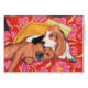 Dharma Basset Hound avec Sophos le laboratoire de bouffe faisant une sieste sur un couvre-lit des pavots rouges et roses