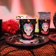 Charmanter Zucker Schädel gerahmt mit bunten Blumen, Süßbrot und glühender Kerze.
