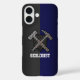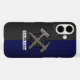 Dieses industriell aussehende Handy verfügt über ein Paar von Gesteinshammer des Geologen, die über ein Schild gekreuzt sind und mit einer abgenutzten, rautenförmigen Blechstruktur dargestellt sind. Der graue und blaue Hintergrund macht Ihren Namen in weißen Buchstaben unter dem Logo zum Pop. Ersetzen Sie den Text durch Ihren Namen oder löschen Sie den Text für eine wortlose Version!