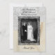 Elegantes Hochzeitsszenario mit Foto- und Text-Vorlagen für Sie. Hellgelber Satin-Hintergrund mit weißer Spitze vorne. Schwarze, Vintage, verzierte Rahmen umgeben Ihr schönes Foto.