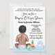Invitation baby shower couche avec bébé doux garçon avec des jouets sur un mignon arrière - plan point bleu.