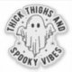 Dieses lustige und spöttische Halloween-Design enthält den Satz "dick thighs and Spooky Vibes", der in einem runden Layout um eine niedliche, klassische Geisterstube angeordnet ist. Der Geist mit seinen einfachen, aber ausdrucksstarken Augen ist der zentrale Fokus des Designs und verleiht ihm ein spielerisches und skurriles Ambiente. Von den Händen des Geistes hängen zwei kleine Spinnen, die dem ansonsten leichtsinnigen Design eine Touch von Kriechlichkeit hinzufügen. Der Text ist fett und sauber, was einen starken visuellen Effekt erzeugt und gleichzeitig einen spielerischen Ton beibehält. Das Schwarz-Weiß-Farbschema verleiht dem Design einen zeitlosen und vielseitigen Look, der es perfekt zu Halloween macht.